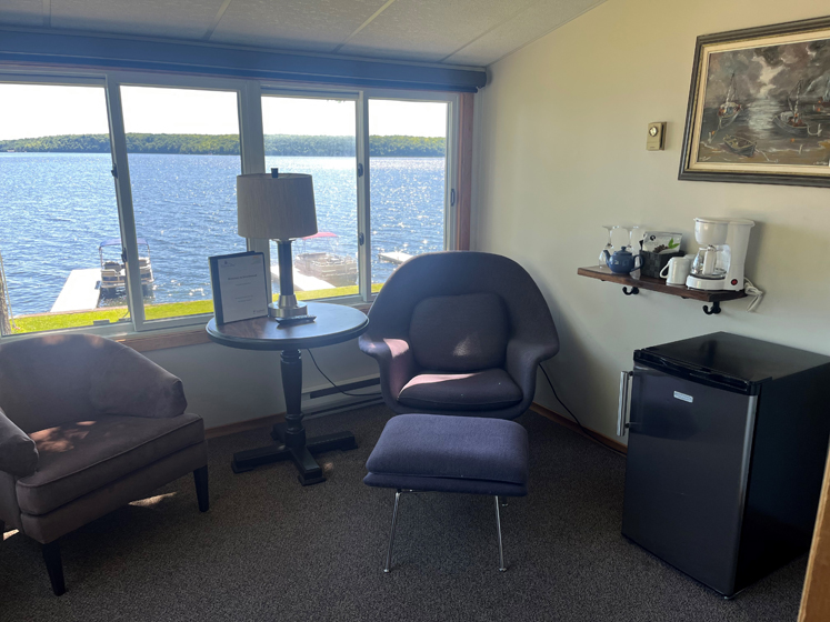 2 room, single detached building, 1 queen, single bunks, sofa bed. Located beside the main lodge. A beautiful view of the lake. In room fridge, coffee maker and microwave. Portable air conditioner